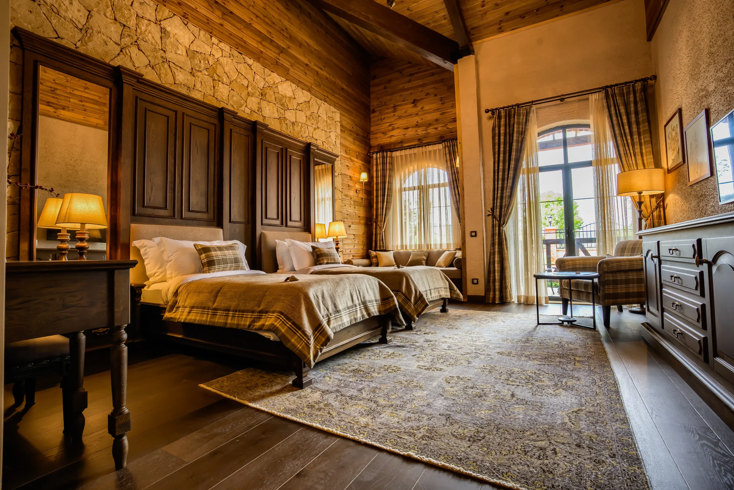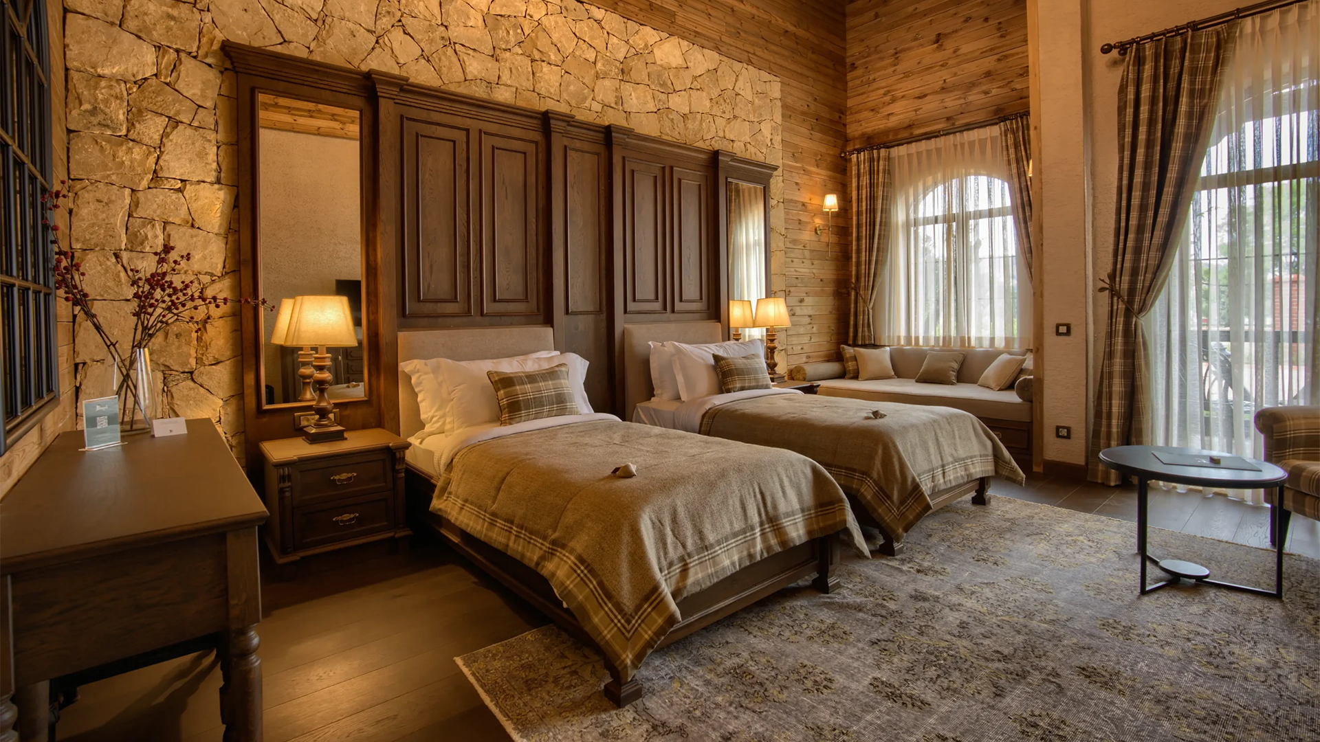 Taş dokusu ve yüksek ahşap çatı tavanları olan geniş ve ferah odalarımızda, kendinizi tam bir ev konforu deneyimi içerisinde bulabilirsiniz.